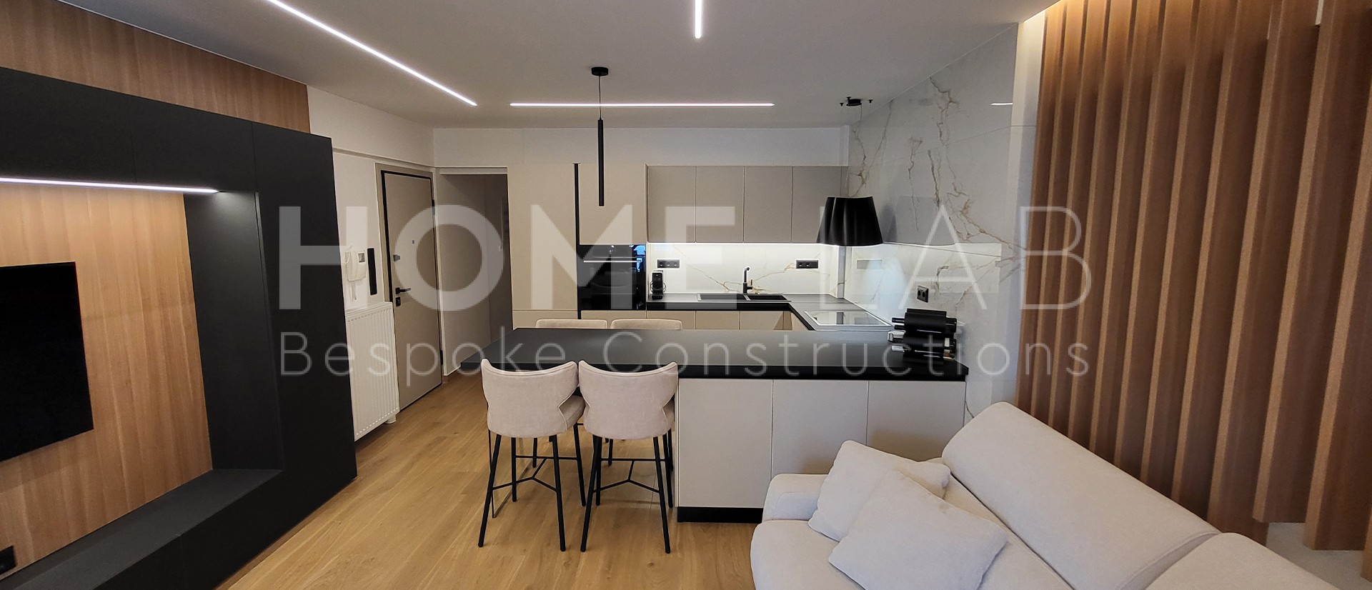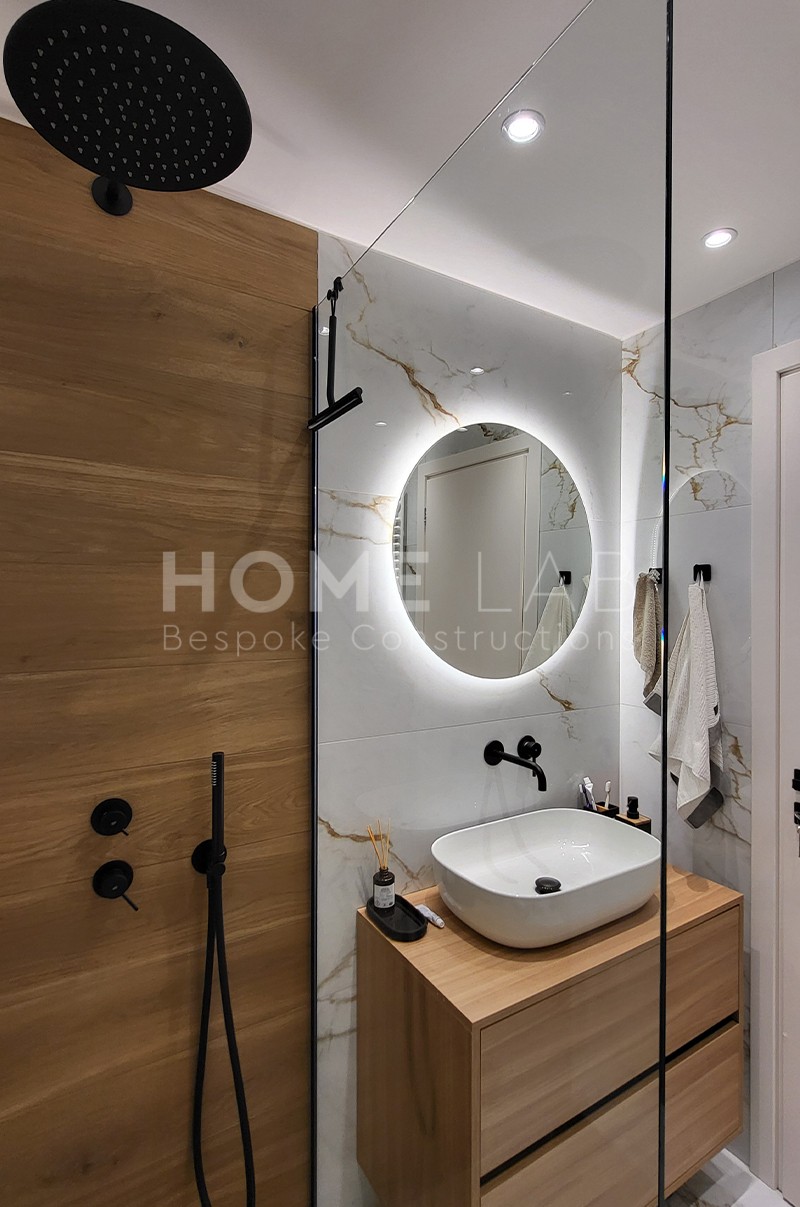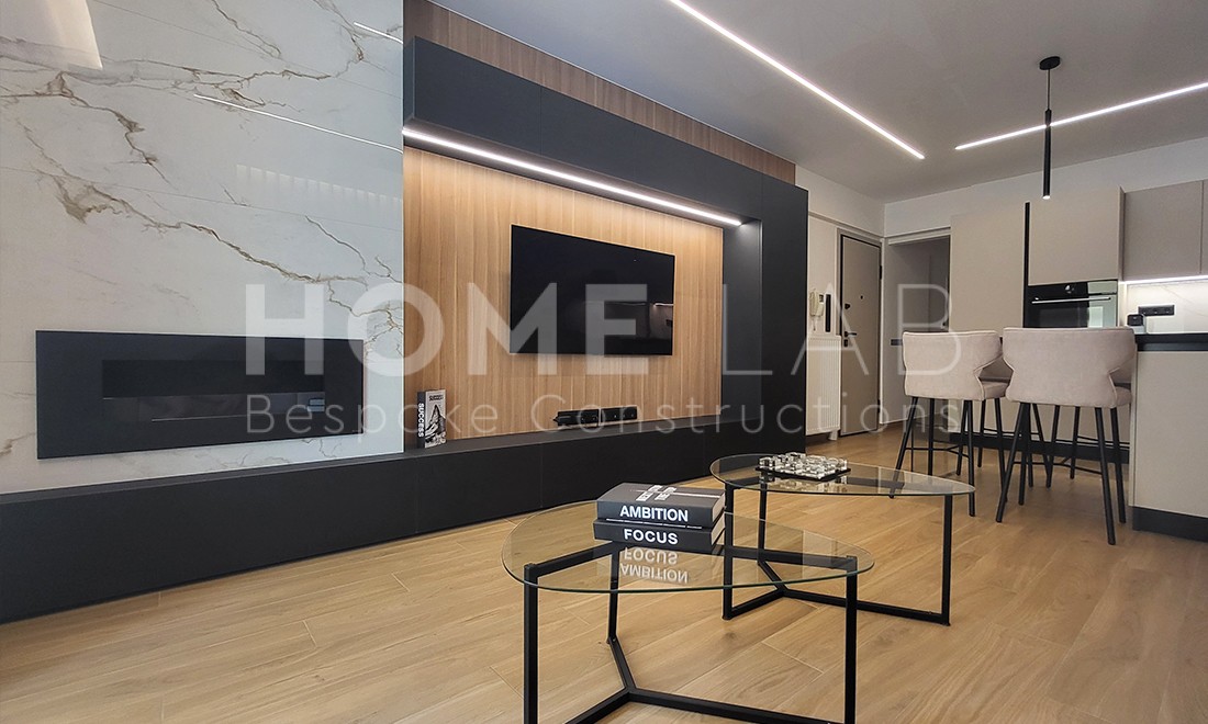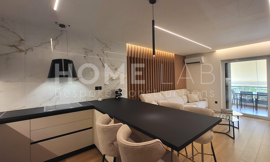 Ο συνδυασμός των αποχρώσεων του ξύλου με το μάρμαρο δίνει πολυτέλεια και ζεστασιά ενώ ο σχεδιασμός των ειδικών κατασκευών και των επίπλων με τις μαύρες λεπτομέρειες μια σύγχρονη αισθητική.