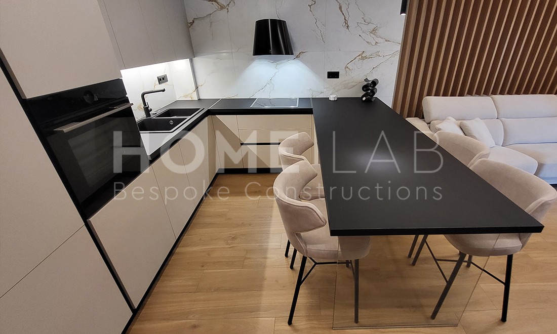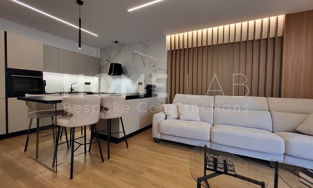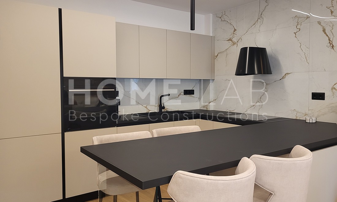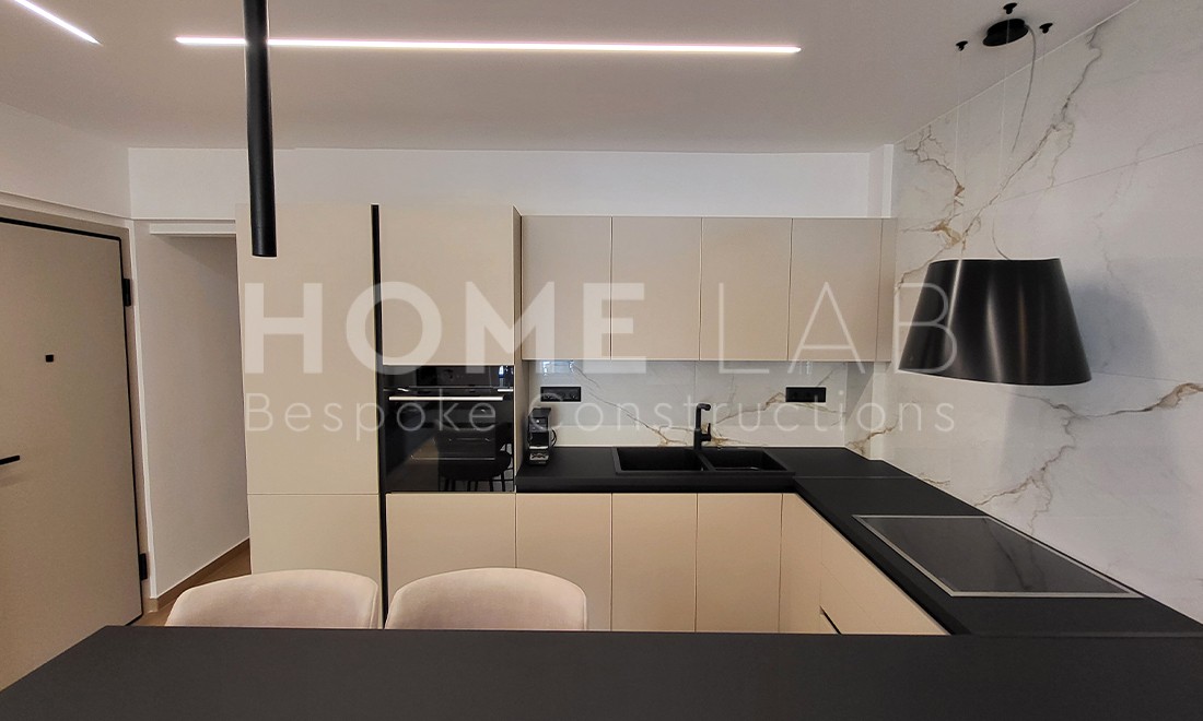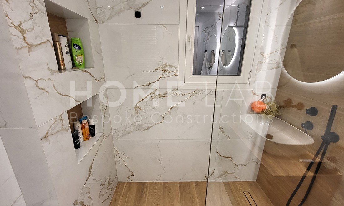Ο συνδυασμός των αποχρώσεων του ξύλου με το μάρμαρο δίνει πολυτέλεια και ζεστασιά ενώ ο σχεδιασμός των ειδικών κατασκευών και των επίπλων με τις μαύρες λεπτομέρειες μια σύγχρονη αισθητική.