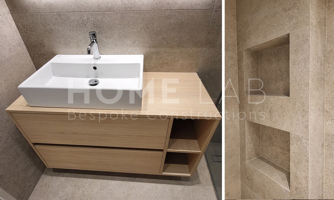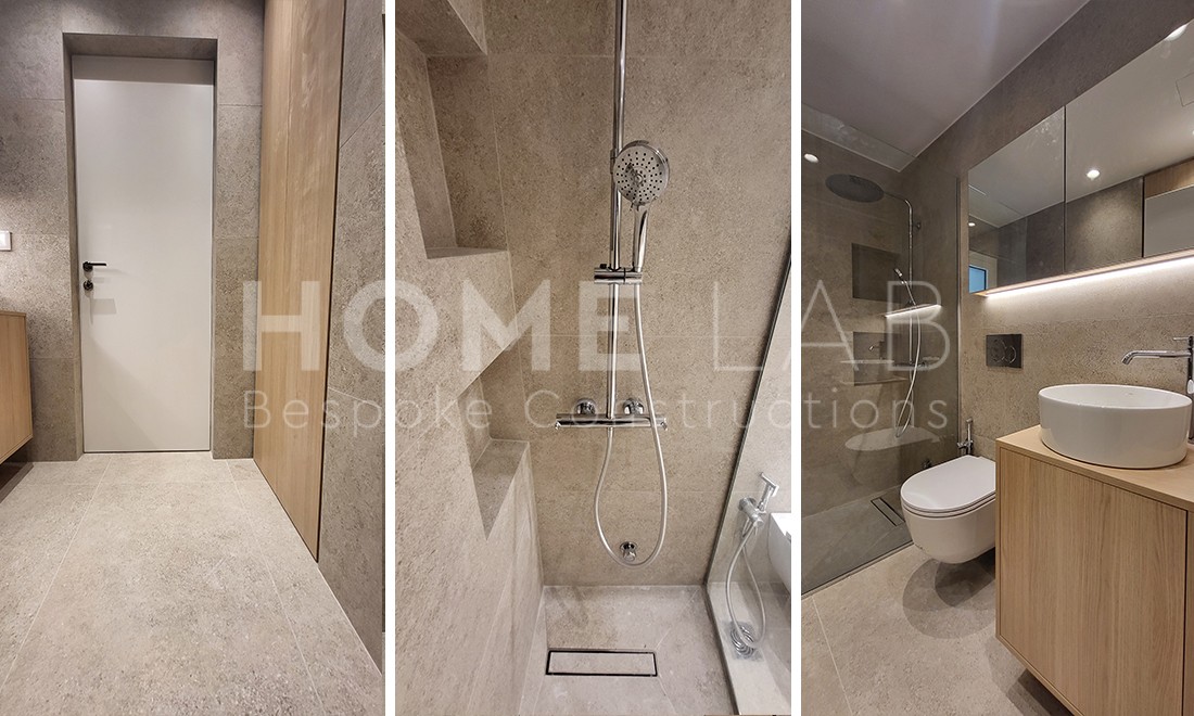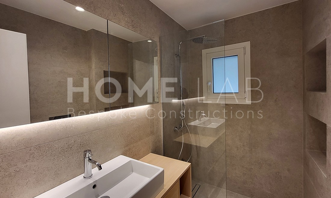 Οι επενδύσεις των δαπέδων και των μπάνιων είναι από το ίδιο γρανιτοπλακάκι μεγάλων διαστάσεων σε γκρι/μπεζ